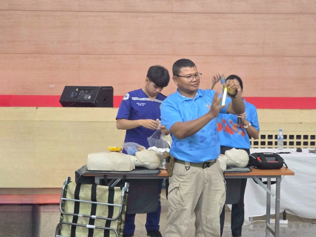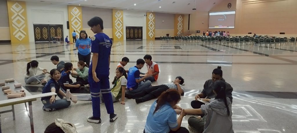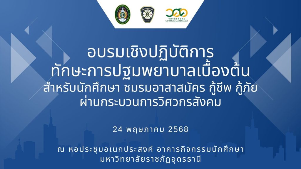 วันที่ 24 พฤษภาคม 2568 เวลา 08.30-16.30 น. กองพัฒนานักศึกษา มหาวิทยาลัยราชภัฏอุดรธานี ได้จัดกิจกรรมอบรมเชิงปฏิบัติการทักษะการปฐมพยาบาลเบื้องต้นสำหรับนักศึกษา ผ่านกระบวนการวิศวกรสังคม เพื่อให้นักศึกษาได้รับความรู้และฝึกทักษะด้านการปฐมพยาบาลเบื้องต้น ในกิจกรรมนี้ได้รับเกียรติจากท่านรองอธิการบดี ผศ.ดร.ชาติชาย ม่วงปฐม เป็นประธานในพิธีเปิดโครงการ โดยมีนักศึกษาจากองค์การนักศึกษา สภานักศึกษา สโมสรนักศึกษาทั้ง 6 คณะ และนักศึกษาชมรมกู้ชีพกู้ภัยเข้ารับการอบรมในครั้งนี้โดยได้รับความอนุเคราะห์จากอาจารย์ประจำสาขาวิชาสาธารณสุขศาสตร์ คณะวิทยาศาสตร์ มหาวิทยาลัยราชภัฏอุดรธานีเป็นวิทยากรถ่ายทอดความรู้และฝึกปฏิบัติการปฐมพยาบาลเบื้องต้น การช่วยฟื้นคืนชีพและการใช้เครื่องกระตกหัวใจไฟฟ้า AED ให้กับนักศึกษาเพื่อให้เกิดทักษะและสามารถนำความรู้ที่ได้ไปใช้ประโยชน์ในชีวิตประจำวันทั้งต่อตัวเอง ครอบครัวและสังคมได้อย่างถูกต้อง