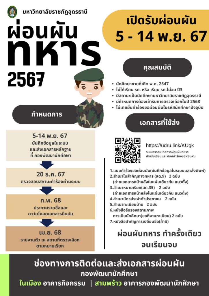 ผู้ช่วยศาสตราจารย์ ดร.คณิศรา ธัญสุนทรสกุล อธิการบดี มหาวิทยาลัยราชภัฏอุดรธานี มอบหมายให้ ว่าที่ร้อยเอกวัชภูมิ เพชรแสงใส ผู้กำกับนักศึกษาวิชาทหาร ร่วมการประชุมรับทราบนโยบายและแผนการฝึกภาคสนามของนักศึกษาวิชาทหาร ชั้นปีที่ 2 – 5 ประจำปีการศึกษา 2568 โดยมี พลตรี ประเสริฐ ข่าทิพย์พาที ผู้บัญชาการมณฑลทหารบกที่ 24 เป็นประธานการประชุม