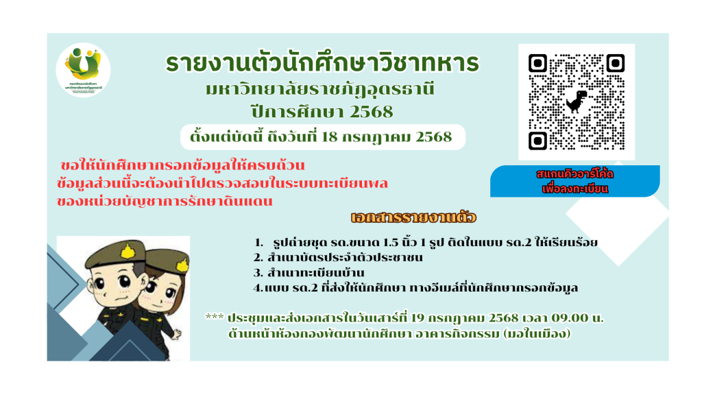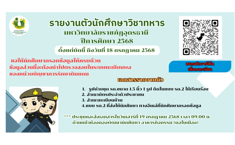 รายงานตัวนักศึกษาวิชาทหาร สถานศึกษาวิชาทหาร มหาวิทยาลัยราชภัฏอุดรธานี ปีการศึกษา 2568 ตั้งแต่บัดนี้ถึง วันที่ 18 กรกฎาคม 2568 ผ่านระบบออนไลน์