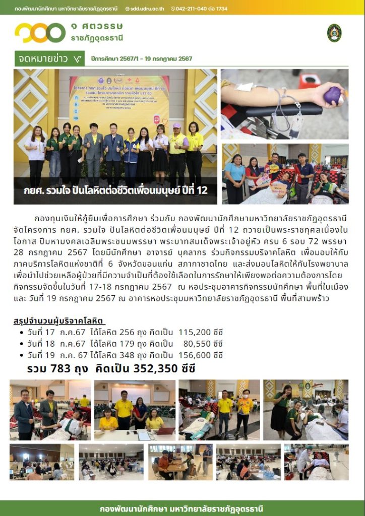 กองทุนเงินให้กู้ยืมเพื่อการศึกษา ร่วมกับ กระทรวงการอุดมศึกษา วิทยาศาสตร์ วิจัยและนวัตกรรม (อว) ร่วมกับ มหาวิทยาลัยราชภัฏอุดรธานี ได้จัดกิจกรรมบริจาคโลหิต กยศ.รวมใจ ปันโลหิต ต่อชีวิตเพื่อนมนุษย์ ปีที่ 12 และกิจกรรมจิตอาสาทำความดี “ทุกยูนิตรวมหัวใจ ชาว อว.พร้อมใจ บริจาคโลหิตประจำปี 2567” เพื่อถวายเป็นพระราชกุศล เนื่องในโอกาส ปีมหามงคลเฉลิมพระชนมพรรษาพระบาทสมเด็จพระเจ้าอยู่หัวครบ 6 รอบ 72 พรรษา 28 กรกฎาคม 2567 ทั้งนี้ เพื่อเป็นการแสดงออกถึงความจงรักภักดี ต่อสถาบันพระมหากษัตริย์ อีกทั้ง กิจกรรมบริจาคโลหิตเป็นกิจกรรมที่ช่วยเหลือประชาชนที่ได้รับความเดือดร้อน จากสถานการณ์ขาดแคลนโลหิตเป็นกิจกรรมสาธารณประโยชน์ต่อสังคม ปัจจุบันมีผู้ป่วยจำนวนมากที่มีความจำเป็นในการใช้โลหิตในการรักษาพยาบาล โรงพยาบาลจึงมีความต้องการเลือดเพิ่มมากขึ้น และปริมาณเลือด ที่มีอยู่ไม่เพียงพอต่อความต้องการ กองทุนเงินให้กู้ยืมเพื่อการศึกษา กองพัฒนานักศึกษามหาวิทยาลัยราชภัฏอุดรธานี มุ่งส่งเสริมที่จะปลูกฝังให้นักศึกษามีจิตสำนึก เป็นผู้มีจิตอาสาและรับผิดชอบต่อสังคม กิจกรรมประกอบด้วย การจัดให้มีการบริจาคโลหิต ระหว่างวันที่ 17 – 18 กรกฎาคม 2567 ณ หอประชุมเอนกประสงค์ อาคารกิจกรรมนักศึกษา พื้นที่ในเมือง และวันที่ 19 กรกฎาคม 2567ณ หอประชุม พื้นที่สามพร้าว