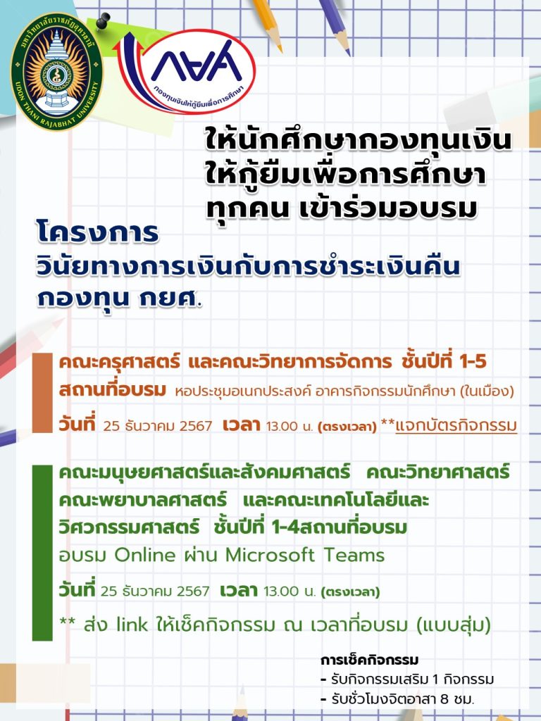 กองพัฒนานักศึกษา มหาวิทยาลัยราชภัฏอุดรธานี จัดโครงการ “วินัยทางการเงินกับการชำระเงินคืนกองทุน กยศ.” ส่งเสริมวินัยทางการเงินและจิตสำนึกในการชำระหนี้ให้แก่นักศึกษา เน้นการอบรมและให้ความรู้เกี่ยวกับการจัดการทางการเงิน รวมถึงการวางแผนการใช้จ่ายและการออม เพื่อให้นักศึกษามีความเข้าใจและความรับผิดชอบในเรื่องการชำระเงินคืนกองทุน กยศ. ในวันที่ 25 ธันวาคม 2567 เวลา 13.00 น. Onsite ณ หอประชุมอเนกประสงค์ อาคารกิจกรรม และ Online ผ่าน Microsoft Teams