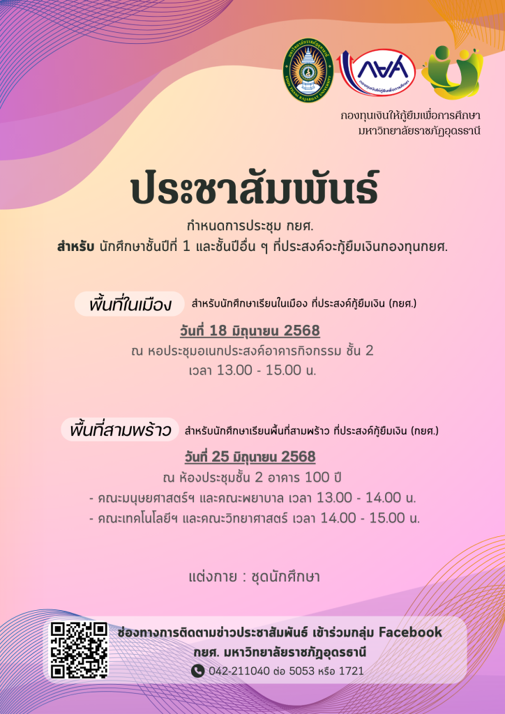 นักศึกษาชั้นปีที่ 1 หรือชั้นปีที่ 2-5 ที่ไม่เคยกู้ยืมเงินกองทุนเงินให้กู้ยืมเพื่อการศึกษากับมหาวิทยาลัยราชภัฏอุดรธานี ปีการศึกษา 2568 ประสงค์จะกู้ยืมเงินกองทุน กยศ. ให้เข้าประชุมเพื่อรับฟังการชี้แจงการดำเนินการเข้าสัมภาษณ์ และทำสัญญา