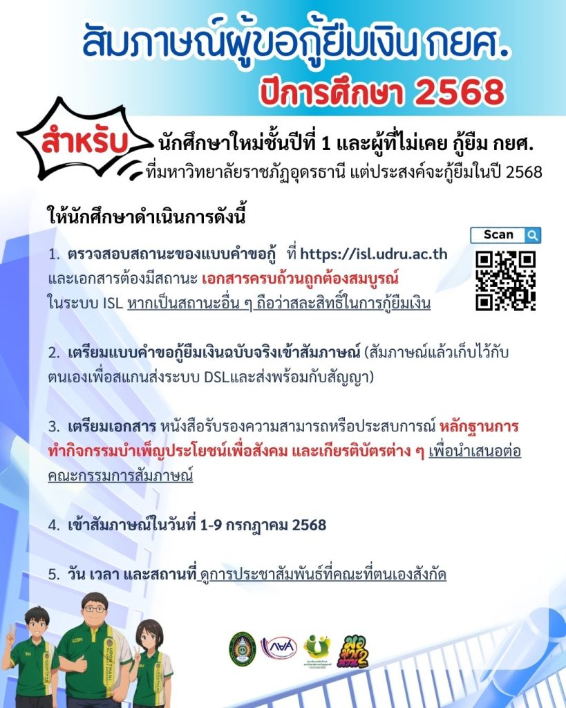 ด้วยกองทุนเงินให้กู้ยืมเพื่อการศึกษา (กยศ.) จะดำเนินการสัมภาษณ์คัดเลือกนักเรียน/นักศึกษาที่ประสงค์จะขอกู้ยืมเงิน เพื่อพิจารณาคุณสมบัติและความจำเป็นในการขอกู้ยืมฯ จึงขอแจ้งให้นักศึกษาที่ได้ยื่นแบบคำขอกู้แล้ว เข้ารับการสัมภาษณ์ในวันที่ 1-9 กรกฎาคม 2568 โดยให้ดูรายละเอียดวัน เวลา สถานที่ตามคณะที่ตนเองสังกัด