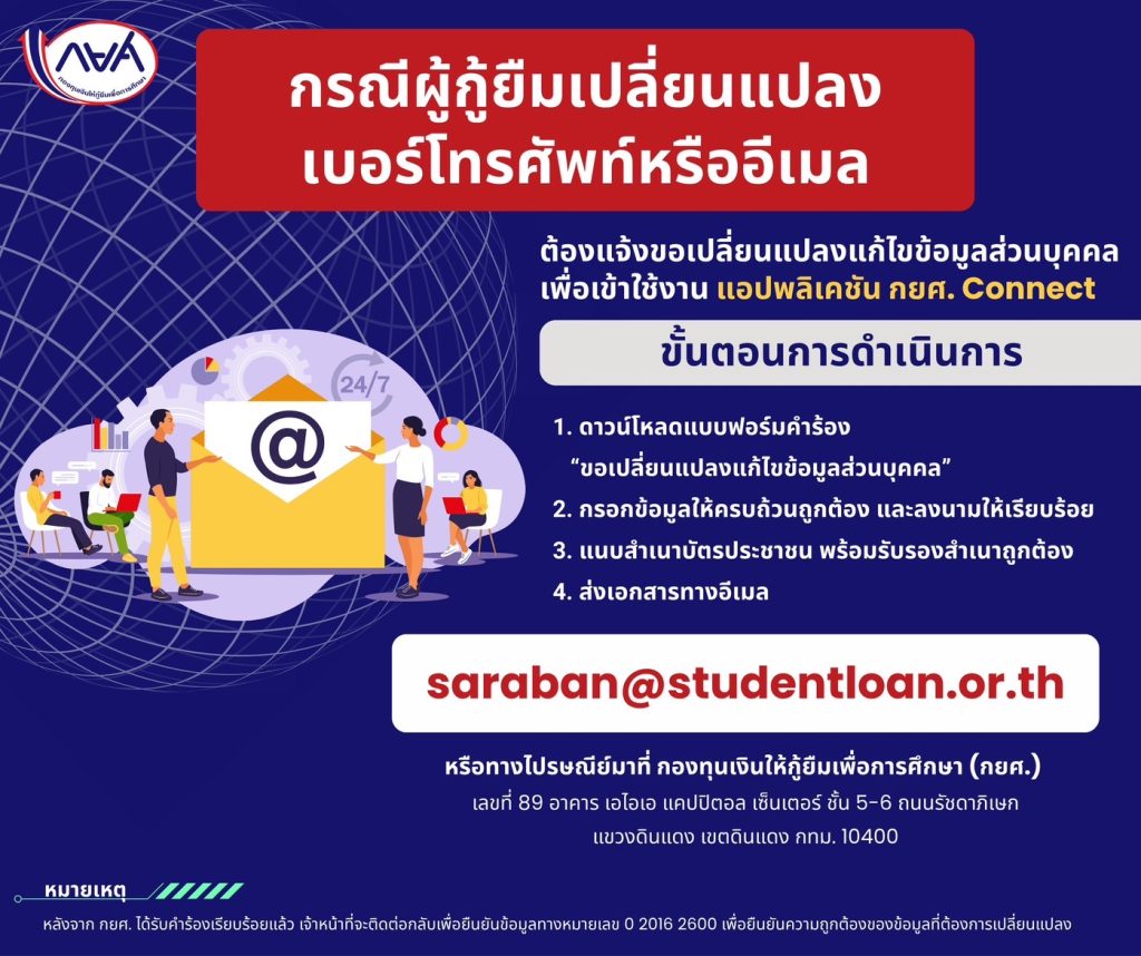 หากเป็นการเปลี่ยนแปลงอีเมล ผู้กู้สามารถเปลี่ยนแปลงด้วยตนเองได้ที่ โปร์ไฟล์ ข้อมูลของผู้กู้ยืมค่ะ