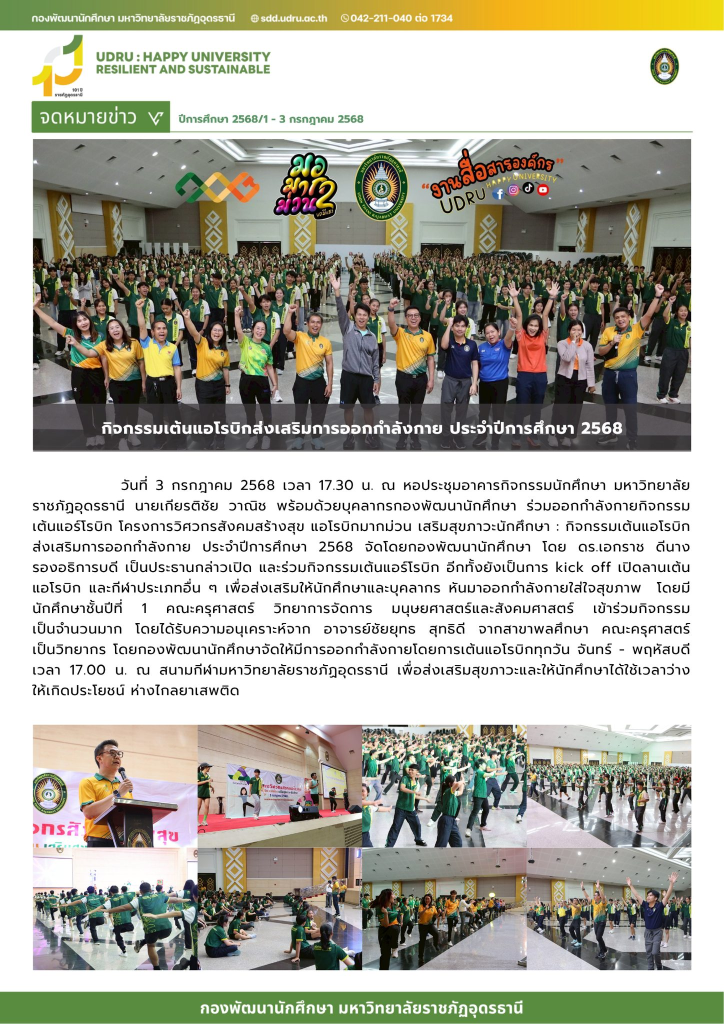 วันที่ 3 กรกฎาคม 2568 เวลา 17.30 น. ณ หอประชุมอาคารกิจกรรมนักศึกษา มหาวิทยาลัยราชภัฏอุดรธานี นายเกียรติชัย วาณิช พร้อมด้วยบุคลากรกองพัฒนานักศึกษา ร่วมออกกำลังกายกิจกรรมเต้นแอร์โรบิก โครงการวิศวกรสังคมสร้างสุข แอโรบิกมากม่วน เสริมสุขภาวะนักศึกษา : กิจกรรมเต้นแอโรบิกส่งเสริมการออกกำลังกาย ประจำปีการศึกษา 2568 จัดโดยกองพัฒนานักศึกษา โดย ดร.เอกราช ดีนาง รองอธิการบดี เป็นประธานกล่าวเปิด และร่วมกิจกรรมเต้นแอร์โรบิก อีกทั้งยังเป็นการ kick off เปิดลานเต้นแอโรบิก และกีฬาประเภทอื่นๆ เพื่อส่งเสริมให้นักศึกษาและบุคลากร หันมาออกกำลังกายใส่ใจสุขภาพ โดยมีนักศึกษาชั้นปีที่ 1 คณะครุศาสตร์ วิทยาการจัดการ มนุษยศาสตร์และสังคมศาสตร์ เข้าร่วมกิจกรรมเป็นจำนวนมาก โดยได้รับความอนุเคราะห์จาก อาจารย์ชัยยุทธ สุทธิดี จากสาขาพลศึกษา คณะครุศาสตร์ เป็นวิทยากร โดยกองพัฒนานักศึกษาจัดให้มีการออกกำลังกายโดยการเต้นแอโรบิกทุกวัน จันทร์ – พฤหัสบดี เวลา 17.00 น. ณ สนามกีฬามหาวิทยาลัยราชภัฏอุดรธานี เพื่อส่งเสริมสุขภาวะและให้นักศึกษาได้ใช้เวลาว่างให้เกิดประโยชน์ ห่างไกลยาเสพติด