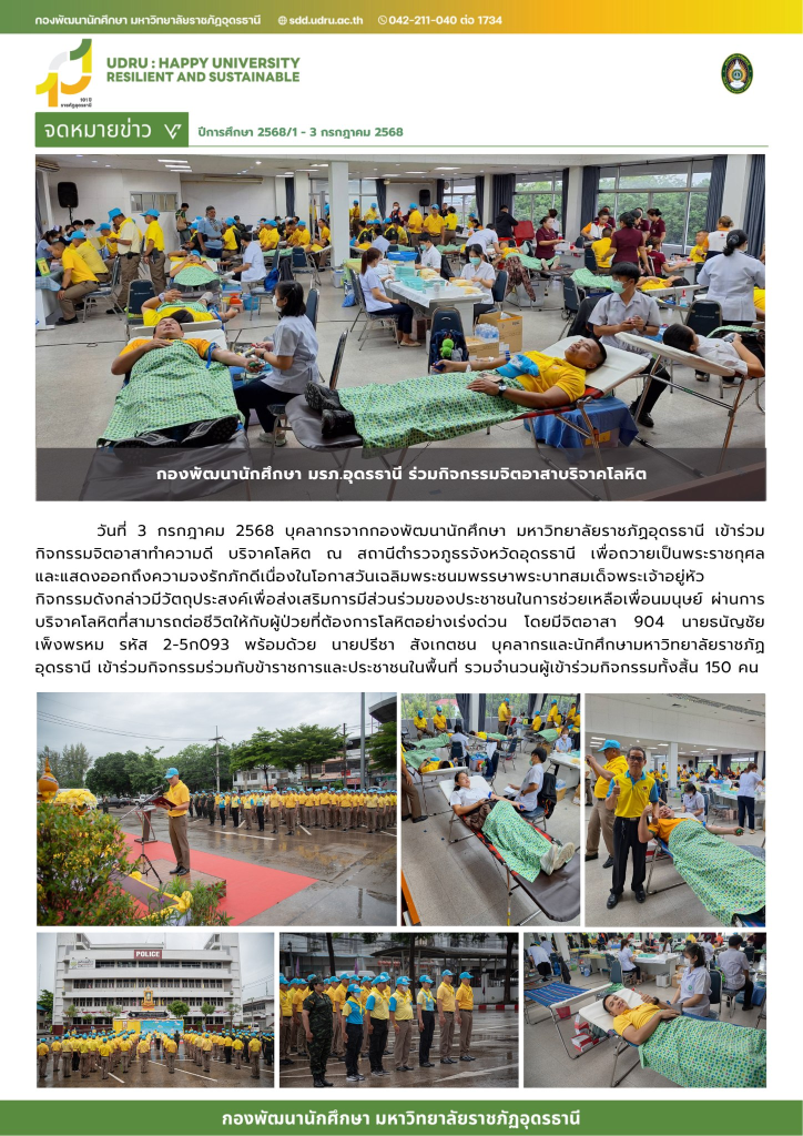 วันที่ 3 กรกฎาคม 2568 บุคลากรจากกองพัฒนานักศึกษา มหาวิทยาลัยราชภัฏอุดรธานี เข้าร่วมกิจกรรมจิตอาสาทำความดี บริจาคโลหิต ณ สถานีตำรวจภูธรจังหวัดอุดรธานี เพื่อถวายเป็นพระราชกุศล และแสดงออกถึงความจงรักภักดีเนื่องในโอกาสวันเฉลิมพระชนมพรรษาพระบาทสมเด็จพระเจ้าอยู่หัว