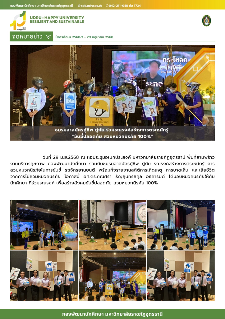 วันที่ 29 มิ.ย.2568 ณ หอประชุมอเนกประสงค์ มหาวิทยาลัยราชภัฏอุดรธานี พื้นที่สามพร้าว งานบริการสุขภาพ กองพัฒนานักศึกษา ร่วมกับชมรมอาสมัครกู้ชีพ กู้ภัย รณรงค์สร้างการตระหนักรู้ การสวมหมวกนิรภัยในการขับขี่ รถจักรยานยนต์ พร้อมทั้งรายงานสถิติการเกิดเหตุ การบาดเจ็บ และเสียชีวิต จากการไม่สวมหมวกนิรภัย โอกาสนี้ ผศ.ดร.คณิศรา ธัญสุนทรสกุล อธิการบดี ได้มอบหมวกนิรภัยให้กับนักศึกษา ที่ร่วมรณรงค์ เพื่อสร้างสังคมขับขี่ปลอดภัย สวมหมวกนิรภัย 100%