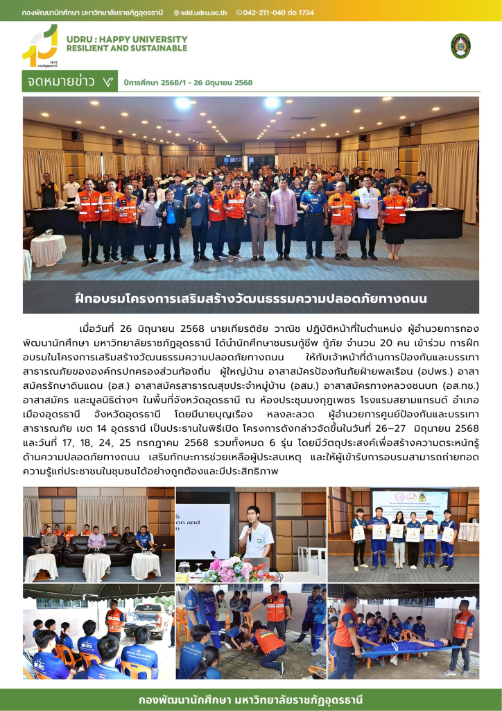 เมื่อวันที่ 26 มิถุนายน 2568 นายเกียรติชัย วาณิช ปฏิบัติหน้าที่ในตำแหน่ง ผู้อำนวยการกองพัฒนานักศึกษา มหาวิทยาลัยราชภัฏอุดรธานี ได้นำนักศึกษาชมรมกู้ชีพ กู้ภัย จำนวน 20 คน เข้าร่วม การฝึกอบรมในโครงการเสริมสร้างวัฒนธรรมความปลอดภัยทางถนน ให้กับเจ้าหน้าที่ด้านการป้องกันและบรรเทาสาธารณภัยขององค์กรปกครองส่วนท้องถิ่น ผู้ใหญ่บ้าน อาสาสมัครป้องกันภัยฝ่ายพลเรือน (อปพร.) อาสาสมัครรักษาดินแดน (อส.) อาสาสมัครสาธารณสุขประจำหมู่บ้าน (อสม.) อาสาสมัครทางหลวงชนบท (อส.ทช.) อาสาสมัคร และมูลนิธิต่างๆ ในพื้นที่จังหวัดอุดรธานี ณ ห้องประชุมมงกุฎเพชร โรงแรมสยามแกรนด์ อำเภอเมืองอุดรธานี จังหวัดอุดรธานี โดยมีนายบุญเรือง หลงละลวด ผู้อำนวยการศูนย์ป้องกันและบรรเทาสาธารณภัย เขต 14 อุดรธานี เป็นประธานในพิธีเปิด