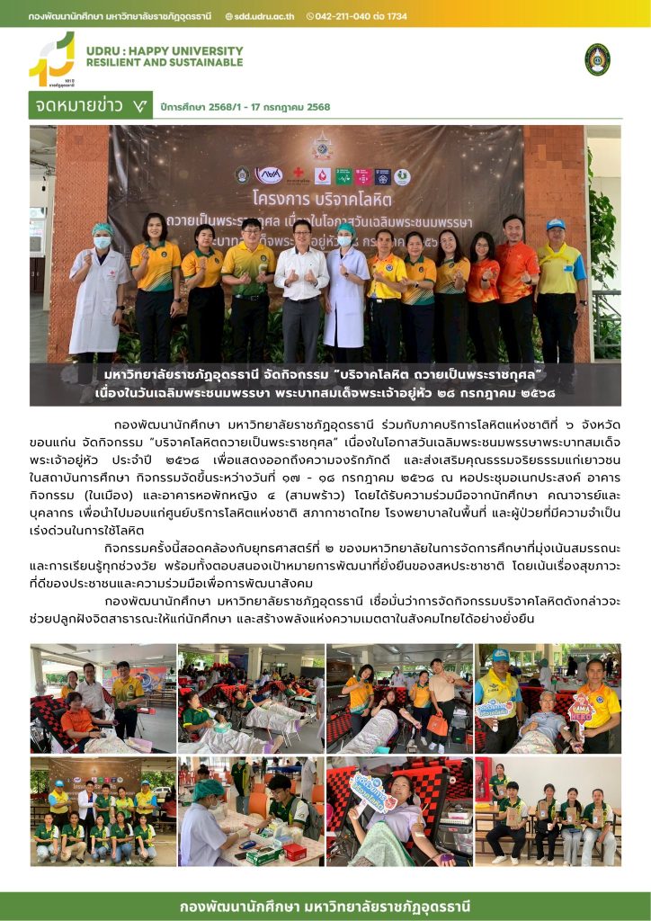 มหาวิทยาลัยราชภัฏอุดรธานี จัดกิจกรรม “บริจาคโลหิต ถวายเป็นพระราชกุศล” เนื่องในวันเฉลิมพระชนมพรรษา พระบาทสมเด็จพระเจ้าอยู่หัว ๒๘ กรกฎาคม ๒๕๖๘
