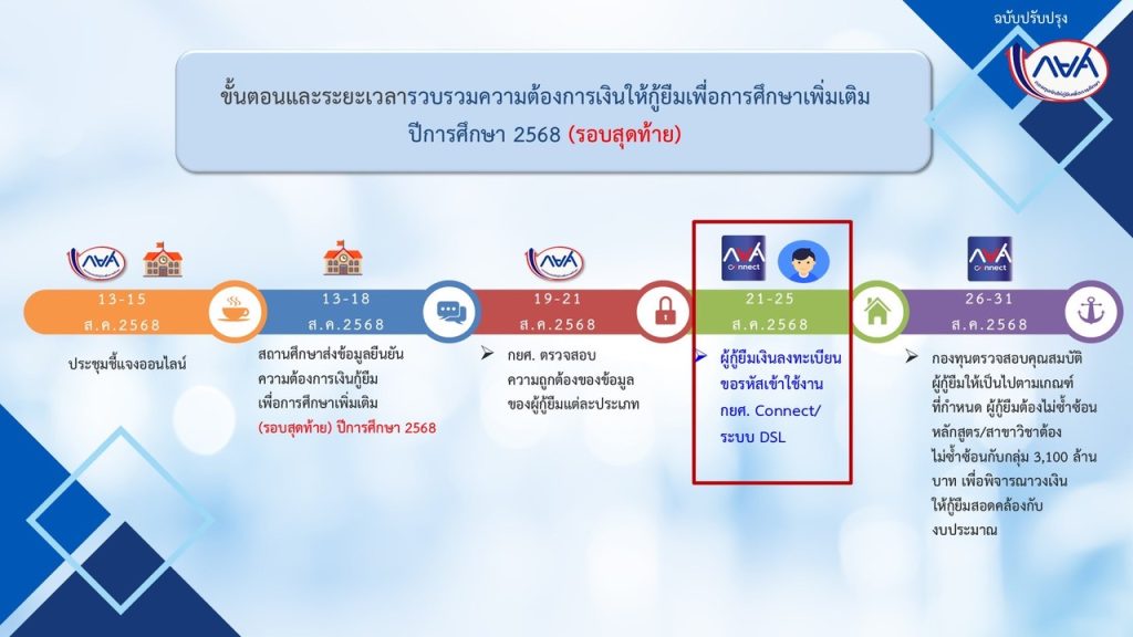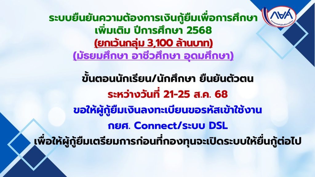 ขอเปลี่ยนแปลงกำหนดการส่งเอกสารแบบคำขอกู้ยืมเงินในระบบ DSL สำหรับกลุ่มที่ยังกู้ยืมเงินกองทุน กยศ. ไม่ได้ในปีการศึกษา 2568 หากมีความชัดเจนจะรีบแจ้งให้ทราบโดยด่วน
