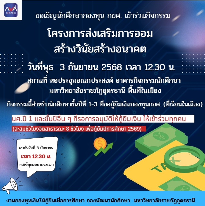 โครงการส่งเสริมการออม สร้างวินัย สร้างอนาคต 📢 ประกาศการเข้าร่วมกิจกรรมสำหรับนักศึกษากองทุน กยศ. ชั้นปีที่ 1-3 เรียนในเมืองทุกคน โปรดแต่งกายด้วยชุดนักศึกษา