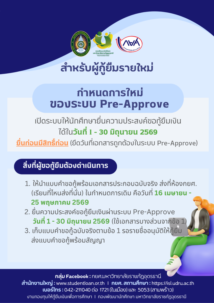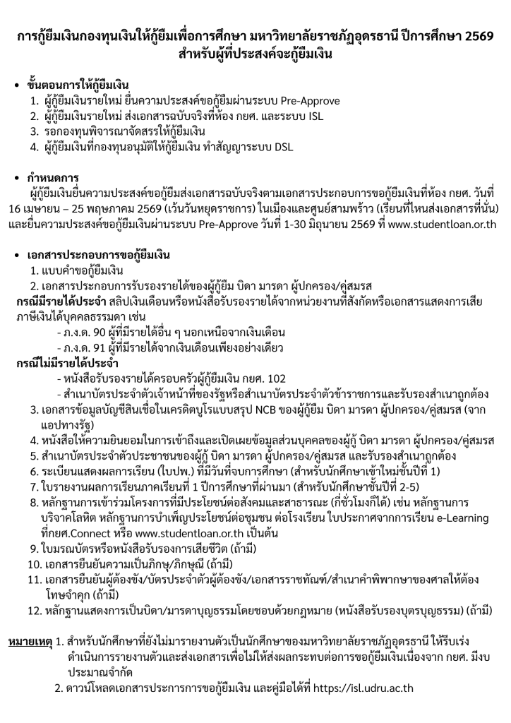 ประกาศมหาวิทยาลัยราชภัฏอุดรธานี เรื่อง กำหนดการให้กู้ยืมเงินกองทุนเงินให้กู้ยืมเพื่อการศึกษา ประจำปีการศึกษา 2566
