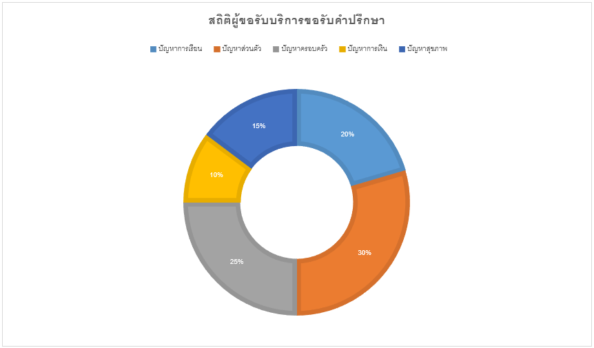 รายงานผู้ขอใช้บริการ ประเภทปัญหาผู้ขอรับบริการจำนวนปัญหาการเรียน18ปัญหาส่วนตัว26ปัญหาครอบครัว22ปัญหาการเงิน9ปัญหาสุขภาพ13